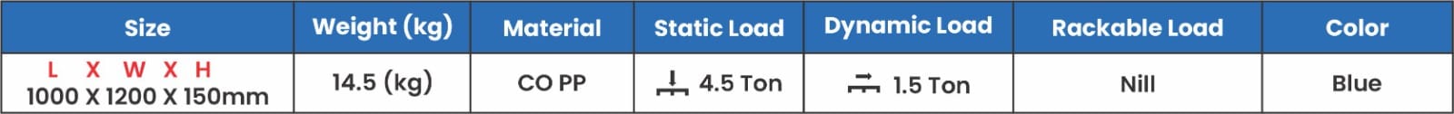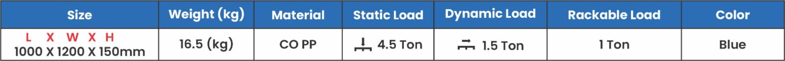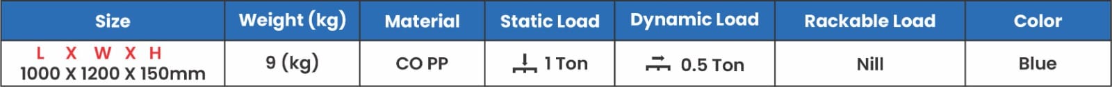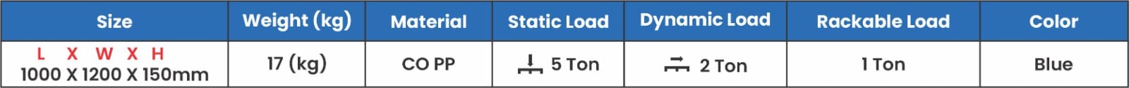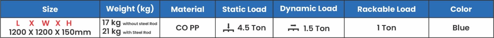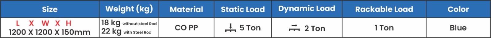 The Plastic Pallet with 5 steel rods is a high-performance, rackable pallet designed for industrial strength and long-term durability. Manufactured using premium COPP (Co-Polymer Polypropylene), this pallet offers superior load-bearing capacity.
